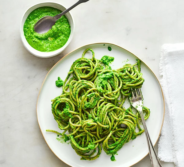 Cook the wholemeal pasta or spaghetti following pack instructions in a pan of water, then toss with the pesto and serve.